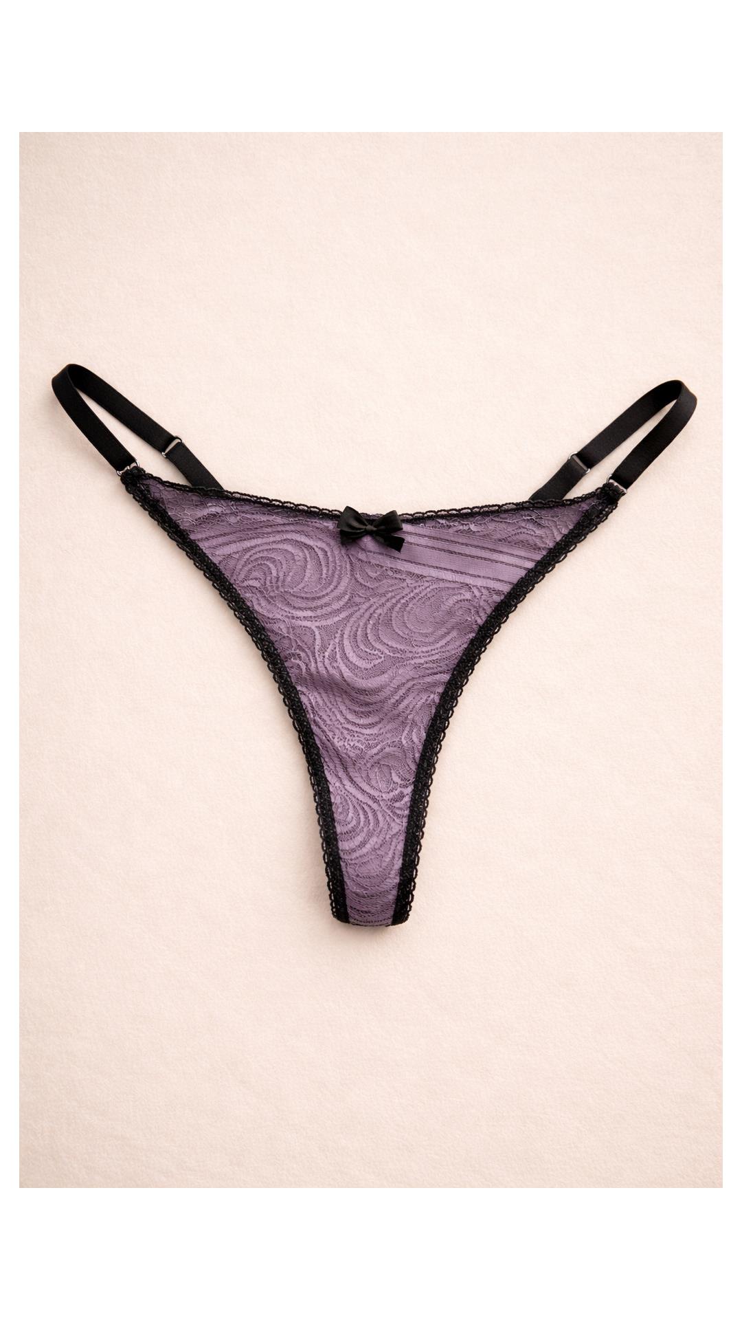 Sensual yet delicate, this semi-sheer lace thong features black adjustable straps, elastic edges, and a matching central bow.